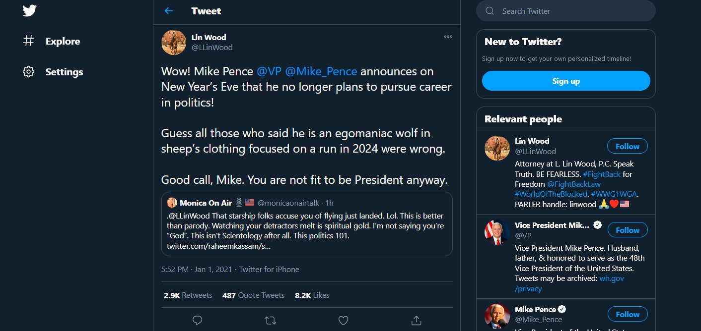 Lin Wood@LLinWoodWow! Mike Pence @VP@Mike_Pence announces on New Year's Eve that he no longer plans to pursue career in politics!