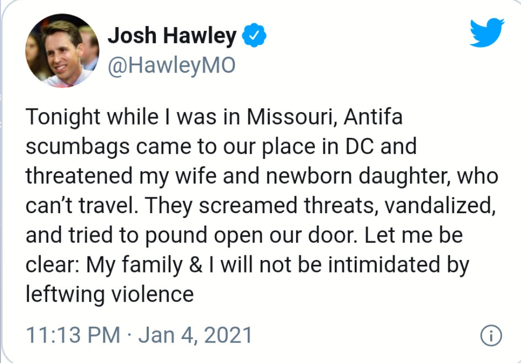Senator Josh Hawley's Family Violently Threatened By Antifa